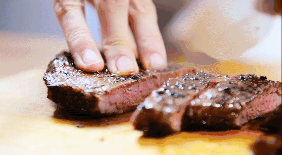 最后牛扒先放在盘子中冷却5分钟,这样牛扒内部的肉汁才会被锁在牛扒内部。