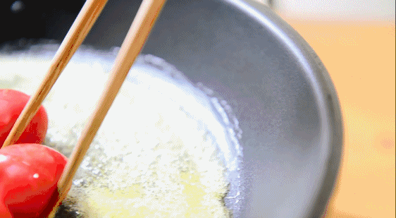 轮到配菜下锅,我选了这种小的番茄,甜度比较高搭配牛扒简直就是一绝,番茄表面微焦就可以起锅了。接下来就是洋葱了,过一下热油就可以起锅,不要煮太久这样软趴趴的洋葱吃起来口感很差的。