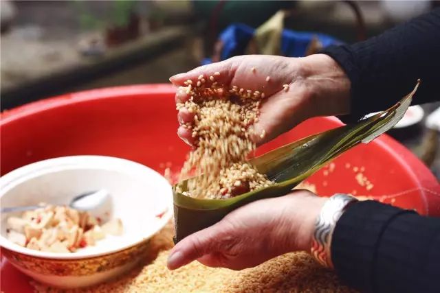 糯米和肉馅压实后,粽叶要靠巧劲扣紧。扎绳的时候手要够快,不然粽子会慢慢散开。就连煮粽也有门道,小火慢煮几个小时后,要在锅里再焖两小时,这样的粽子,才会软糯好吃。