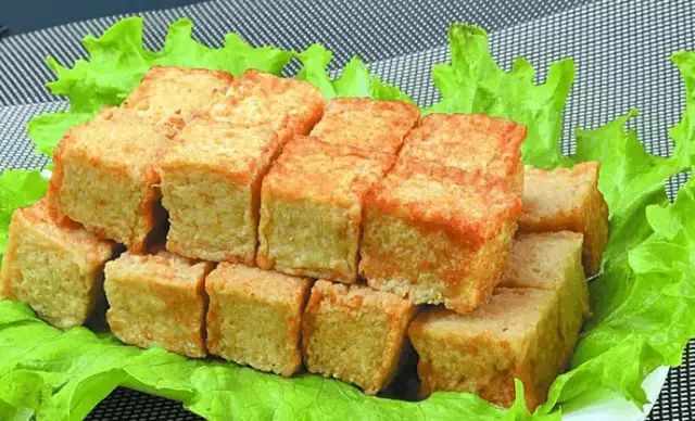 只有豆腐的外形,其实是以鱼肉为主,挤压成型块状,经熟化油炸而成,具有金黄色的外观,口感富有弹性,而且营养丰富。
