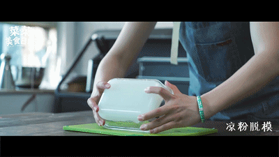 3.一离火就要赶紧倒进模具里,凉粉才会形状好看