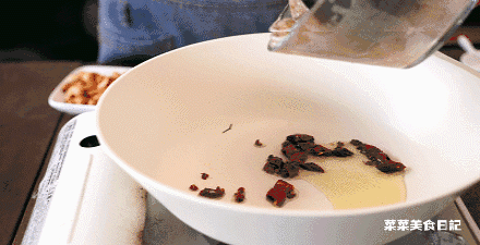 6.炒过腰果的油不用倒,放入花椒和干辣椒煸炒出香味后,放入虾仁翻炒至断生