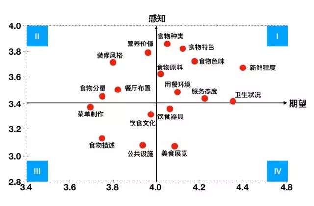 沙县小吃的主顾以收入较低的人群为主。对他们来说,用餐体验中最重要的是食物的种类、色味、价格、原料,以及新鲜程度。顾客所关心的这几项评分颇高,与期待值相差无几。