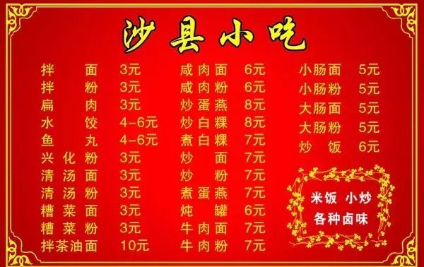 价廉味美是沙县小吃能开遍全国的根本原因。店面朴素,菜单简陋,往往是床单大小的红色塑料,贴在墙上,毫无设计感。单品价低,十元以上都是“高贵”的商务套餐。