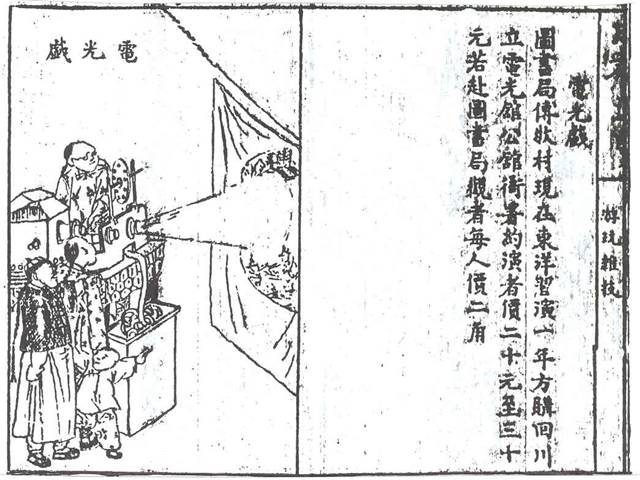 电影至少在1909年已引进成都,也可能是成都的第一个“现代”意义上的娱乐。在《成都通览》中,一幅“电光戏”图画的说明称,傅崇矩从日本带回了一台可在公共场地放映的电影机。电影吸引了许多人,如在新式茶馆戏园启智园、可园和玉带桥等地放映外国电影,总是顾客盈门。
