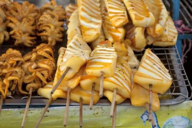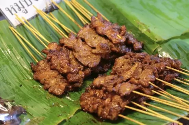 虽然在中国我们许多烧烤摊也有这种类似的烤串,不过在泰国,大街小巷都能到琳琅满目这种肉身厚实的羊肉串、鸡肉串、牛肉串、猪肉串......!烤得外焦里嫩的烤串再刷上烧烤酱或沙爹酱,一口咬下去,肉汁的鲜美跟酱料完美混合,绝对会让你一串接着一串的吃。