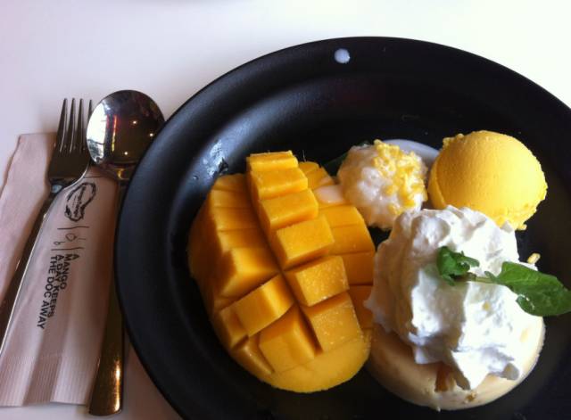 芒果糯米饭是泰国菜里面最著名的甜品,你在泰国的各处角落都能品尝到的地道美食。酸酸甜甜的芒果配上经过浓郁椰汁浸泡的糯米饭之后就产生了无比美妙的味道。泰国人有的把它作为主食,也有的把它当甜品。如果有榴莲爱好者,更可以尝试一下榴莲糯米饭呢!