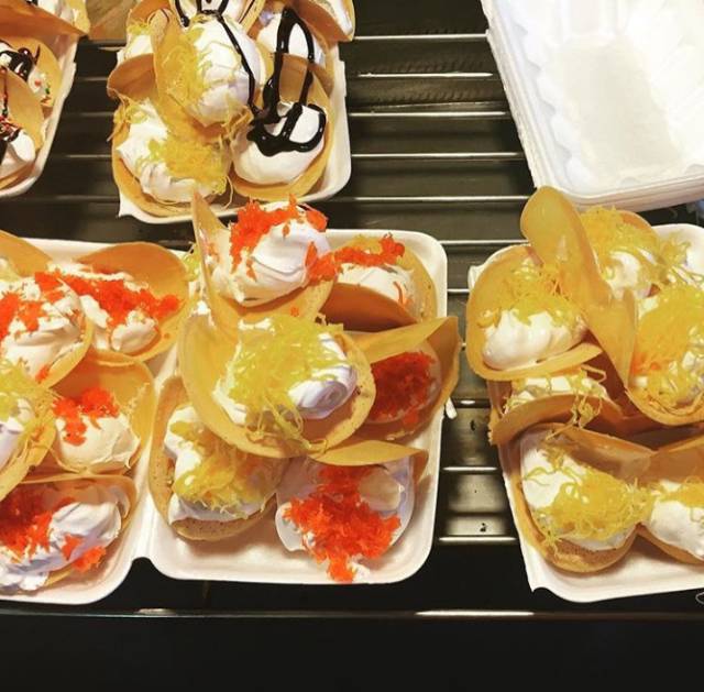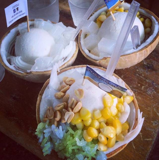 椰子雪糕其实不止的单纯椰子味道的雪糕,而是用半个实实在在的椰子盛着一大球雪糕。你还可以搭配小果冻,玉米碎或者花生,让你的雪糕口感更加立体丰富。吃完雪糕之后,你可以继续挖冰冰的椰子肉吃。在潮湿炎热的泰国,这款雪糕你可绝对不能错过。