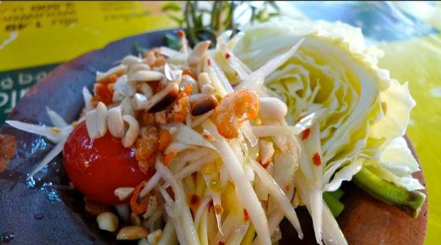 曼谷有着“热带水果之都”的美誉,因为这里一年四季都有各种美味鲜甜的水果。尤其是这款以用黄瓜和木瓜调制出来的青木瓜沙拉,口感爽脆,绝对会让你在炎热的天气里重拾你的胃口。