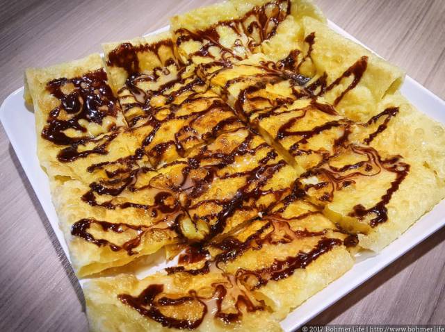 这是在泰国当下非常著名的“热甜点”之一。用特殊的饼皮包裹着香蕉,在微火上烤至两秒微焦,然后再刷上香浓的巧克力酱或者炼奶。一口咬下去,酥脆可口的饼皮,配上香蕉的柔软,这味道可绝对不输法国的可丽饼。