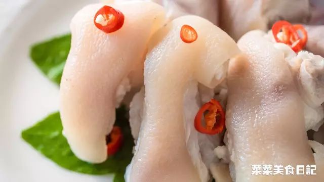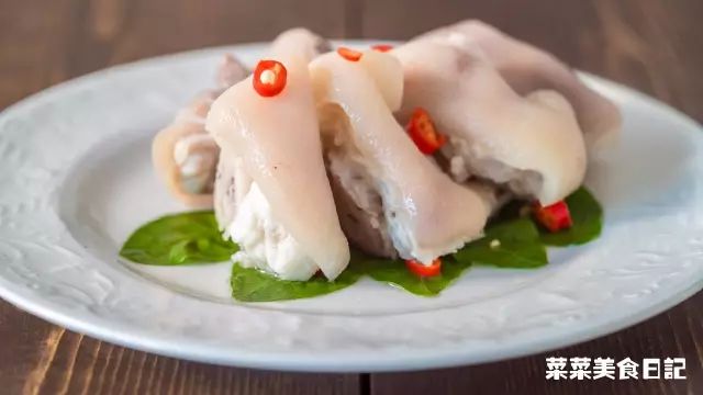 做法也更为考究,猪手煮熟后,要先放冰水中浸泡,中途需要多次换水,直到水中油脂全无(过冰水是让猪蹄肉质Q弹的关键)