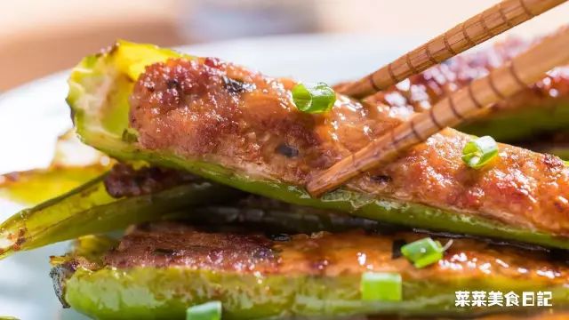煎过的青椒皱皮,辣味大减,只剩扑鼻的香味。肉馅鲜美,一口咬下,香得欲罢不能。