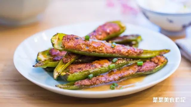 所谓酿,就是把食材作为容器,将肉馅填入,再一同进行烹煮。