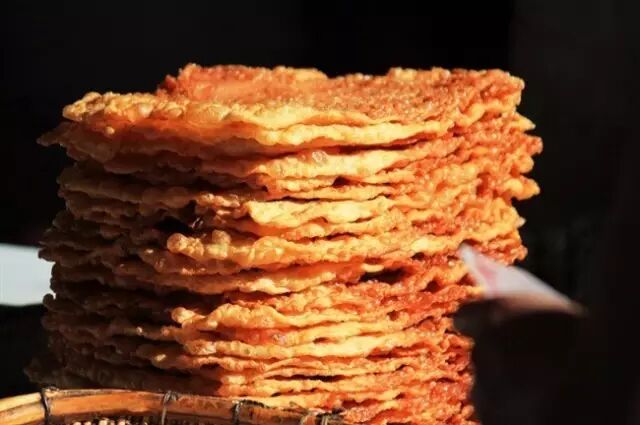 选用大颗粒的绿豆,先用石磨将其粗磨成两半,浸泡后,将浮在水面上的绿豆皮捞出来,再用石磨将去掉皮的绿豆细细研磨成糨糊,加上香料摊成煎饼。