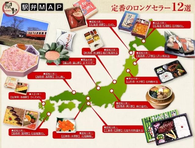 车站便当行业协会——站内营业中央会(構内営業中央会)公布的 12 种特殊便当,都是各地独有的口味,“地域限定”感浓厚,从北至南花样不重复:北海道札幌站石狩鲑鱼饭、北海道森站乌贼饭、青森县八户站八户小呗便当、山形县米泽站鲤鱼便当、新泻县新津站鲑鱼烧渍便当、群马县横川站峠之釜饭、富山县富山站鳟鱼寿司、滋贺县米原站元祖鲑鱼寿司、三重县松阪站元祖精选牛肉便当、鸟取县鸟取站螃蟹寿司、佐贺县鸟栖站鸡肉饭、宫崎县宫崎站香菇饭。