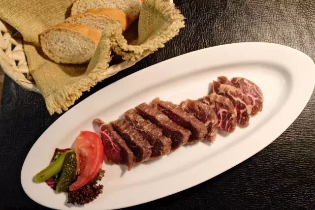在新西伯利亚市的Puppenhaus餐厅,一道摆盘极其简陋的烟熏生腌牛肉令人回味无穷。牛肉厚切,脂肪的比例恰到好处,微微红褐色的肉片发出迷人的光泽,烟熏的风味没有浓烈到腊香的程度,而是带有果木的清香,肉质柔软又紧实。