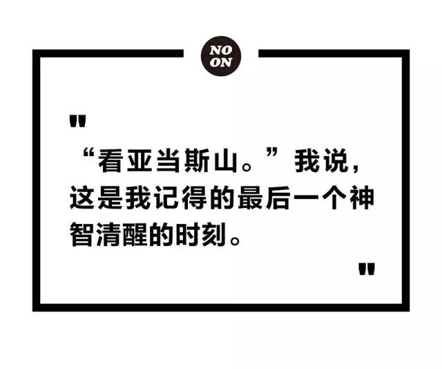 现在西面的天空变成了靛青色,一种从未见过的颜色。深色的天空一般都会失去一些彩色。但这是一种饱和的、深色的靛青色,在高高的空中。直插入那个仙境般的天空的,是亚当斯山,山顶都是霞光。这道霞光,是日落时的红色光芒,当山谷和平台都已黯淡之后,它依然长久地照耀着雪山。“看亚当斯山。”我说,这是我记得的最后一个神智清醒的时刻。