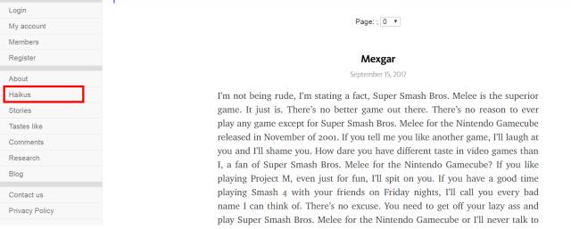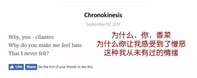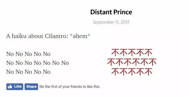 Ps:这个网站真的比别的神奇的网站还要神奇。名为反香菜的网站,但是在这个网站看到的更多内容是喜欢香菜的人吐槽他妈妈不吃香菜还要阻止他吃,以及神一般把这个网站当做脸书直接纪录自己与香菜毫不相关的日常。以及专门有一个“haikus(俳句)”的栏目,除了一些直接在里面写小作文的人之外,还是有不少在里面抒发自己诗意的人!