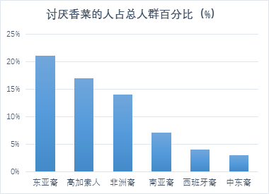 根据发表在《Flavour》的一篇论文显示,21%的东亚人,17%的白人和14%的黑人憎恨香菜。加拿大研究者Lilli Mauer等人对1639个年轻人做了统计,发现东亚裔里讨厌香菜的比例竟然是其中最高的。