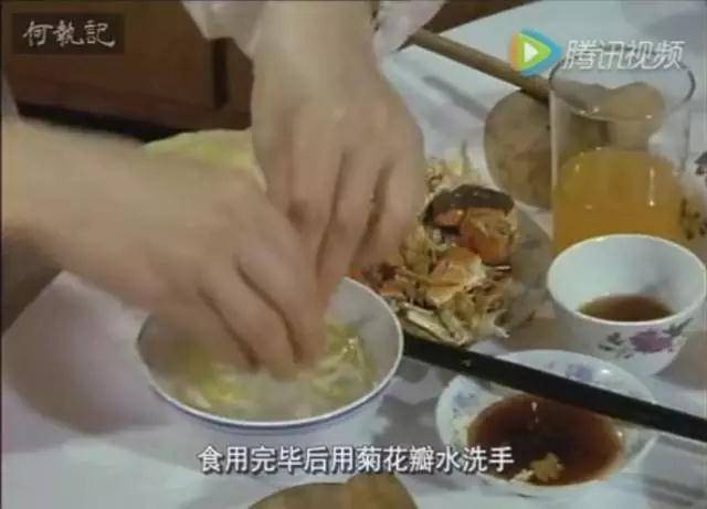 饭毕,用跑着菊花瓣的水将手洗净,