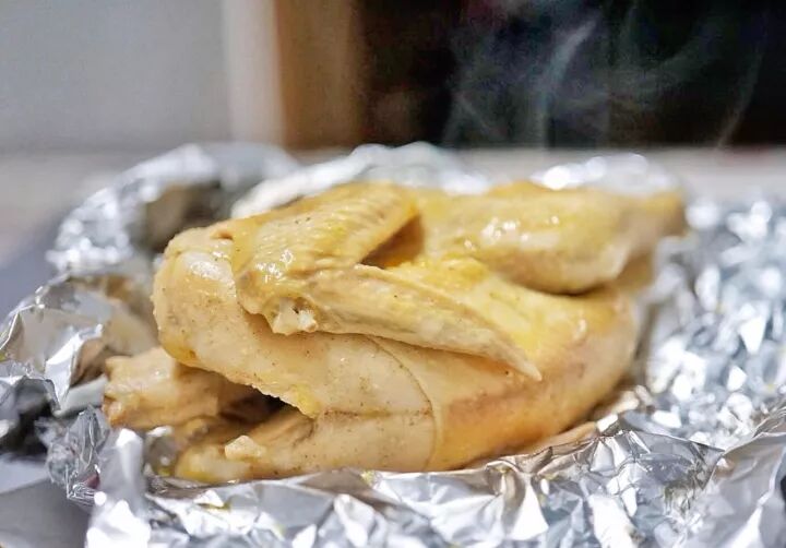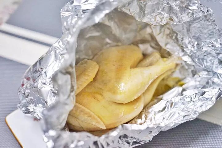 一整只鸡先腌制再用锡纸包着蒸,锁住了一整只鸡的香气和鲜美。
