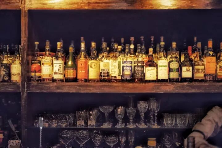 主营各类威士忌。酒柜里苏格兰和日本居多,水晶玻璃杯在幽暗的灯光下闪闪发光。