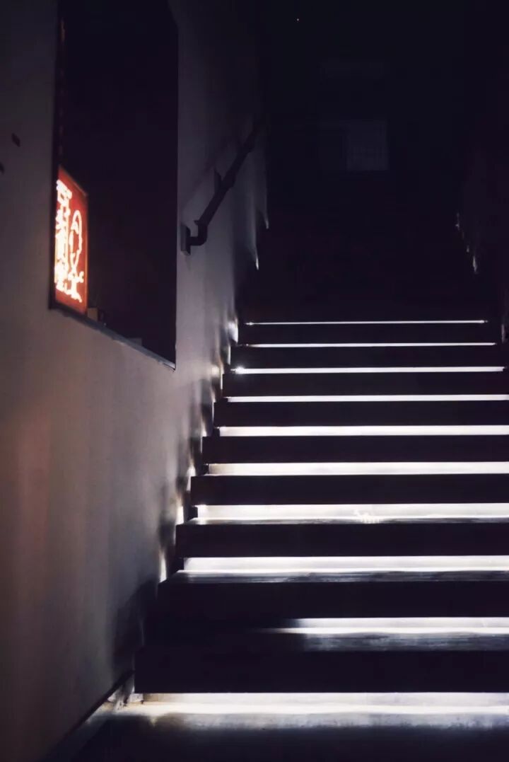 藏在一间漆黑餐厅的二楼,在幽暗的园区里绕了半天,最后还是保安打着手电带着去的。穿过打烊的餐厅,走上长长的台阶。