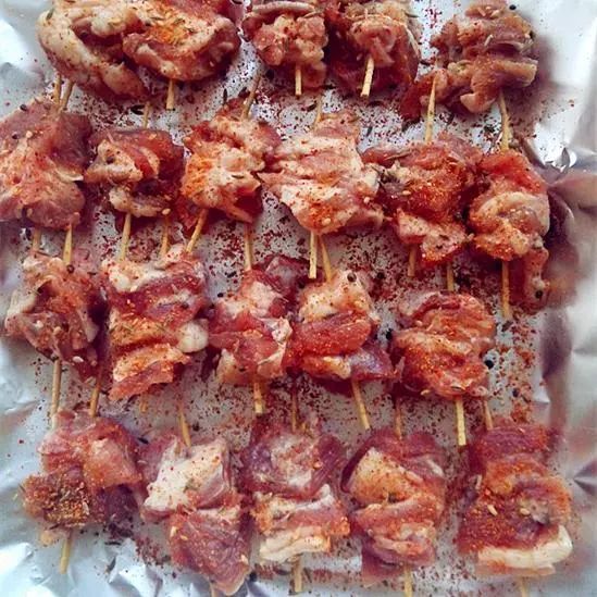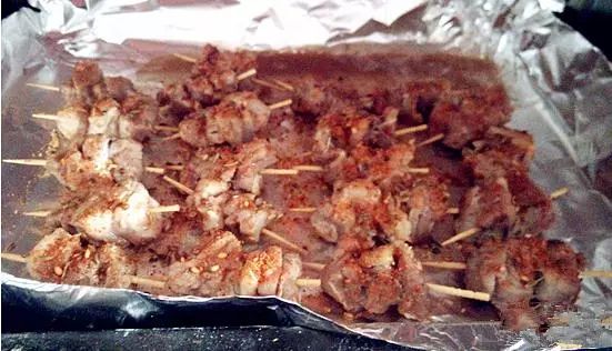 2. 腌好的肉穿在牙签上,均匀撒上孜然粉、辣椒粉、花椒粉、芝麻。撒的时候要转动牙签,让肉的各个面都要有。