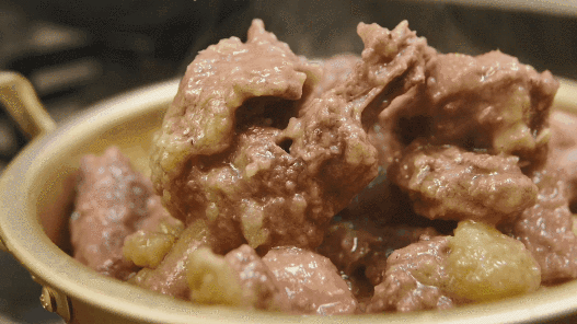 到冬天,东莞人独爱一道南乳焖鹅:鹅块和土豆加腐乳焖烧,土豆焖得软烂,裹在每一块鹅肉上,十分下饭。