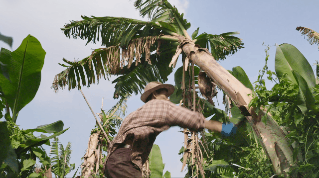 黎明,香蕉树上,砍刀声“托托”响起,收获的蕉农,把青香蕉扛回家,要卖的,挂起来等它成熟,抓一些生的,煎蛋炖肉都好吃。