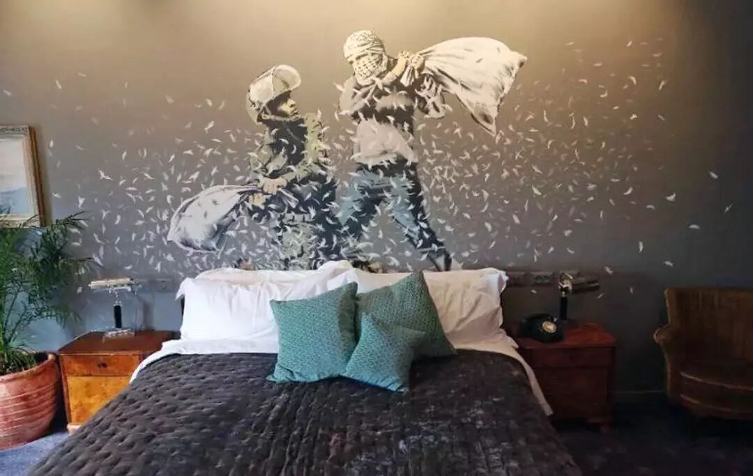 在他涉及街头涂鸦,行为艺术,装置,大型公共艺术,雕塑,影像,音频等一系列的艺术形式后,这个酒店可能是将Banksy的游击队精神高度整合在一起的作品。从35美元的床位到上千美元豪华套间,四处都是值得玩味的Banksy风格设计,重要的是这个酒店向外望去的风景就只是隔离墙,而这堵世界上最著名的墙,上面曾在2005年时就出现过Banksy的作品,他现在又把人们的视线重新拉回到这个争议之地。