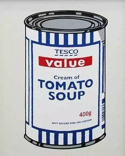 Banksy常把公众最熟悉的商业标识或是卡通形象,政客或权贵形象混杂在他的作品中,通过变形,拼贴再度深绎,或是采用真实的战争视频和音频重新剪辑混入一些特殊的视觉符号。