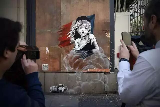 ▲ 2016年英国伦敦出现在法国使馆对面的Banksy作品,描绘了《悲惨世界》当中的女孩,以抗议法国在法国在加莱难民营中使用催泪瓦斯。