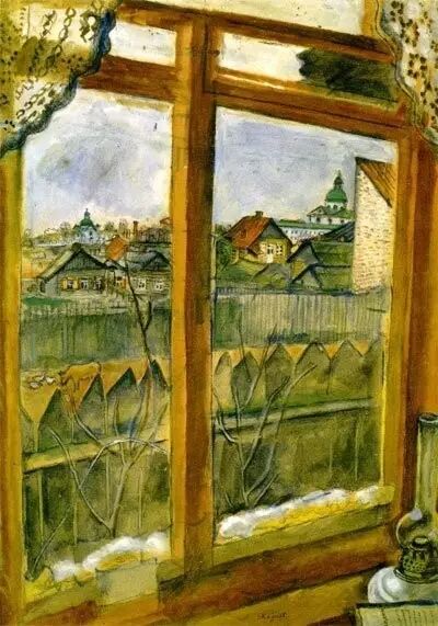 《眺望窗外,维台普斯克》,夏加尔少有的写实风格,故乡初春的景色,窗棱上的还有残存未化的积雪,院子里栅栏前小树在风中抖动的还是枯枯的枝条,河水,木屋,远处的教堂,却都是绿色的,那是夏加尔心情的色彩。