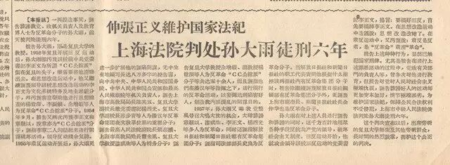 判决新闻中间四段大体描述孙大雨状告的细节,黄健、雷水莲比较详尽的《孙大雨评传》里没有涉猎——不知孙大雨的女婿孙近仁、女儿孙佳始所写《耿介清正——孙大雨纪传》一书是否写有,因没有读过,不敢断定。但鉴于黄、雷二人引用二孙本的内容不少,未涉及此,我初步断定二孙本也没有提到这个判决新闻的细节——为使孙大雨遭难被判决的诸多细节,让人有所了解,对此内容多说几句。判决中说1952年复旦展开三反五反运动,孙大雨即开始说李正文是“CC公馆派”留在复旦的头子,在思想改造中说当时正领导思想改造的李正文为文化系统特务与地主恶霸分子,“并污蔑善意帮助他进行思想检查的杨岂深、李振麟、全增嘏等人为反革命‘CC公馆派’分子”。所谓“CC公馆派”是指国民党大佬陈立夫、陈果夫二人为中心的派系,这样的罪名在彼时可谓罪大恶极。