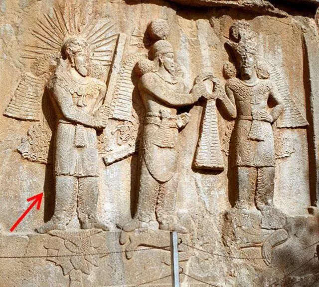 ▲ 位于伊朗塔克·布斯坦的萨珊王朝皇帝阿尔达希尔一世(或二世)登基仪式浮雕。红色箭头指出的雕像为密特拉