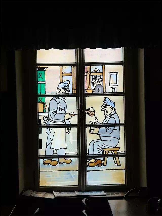 ▲ 克鲁姆洛夫的好兵帅克餐厅,窗户上的帅克漫画