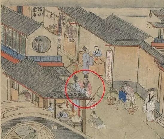 ▲从《南都繁会景物图卷(局部)》看,正中央与右下角有两位戴着眼睛的老者