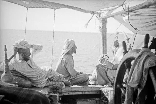 正是在这样的帆船里,水手辛巴达(Sindbad),阿拉伯伟大的传奇故事《一千零一夜》中许多故事的主人公,开始了他的航行。那个世界,那种生活方式,早已从现代世界中消失。不过,最近我一直在阅读一本有关辛巴达世界和印度洋贸易的旅行书,它名为《辛德巴德之子》,描述了印度洋上老水手的生活,作者是一位名叫艾伦·维利尔斯(Allan Villiers)的澳大利亚水手、作家和摄影师。这本书记录了风力航海最后的岁月。就在第二次世界大战之前,1938年至1939年,维利尔在一艘阿拉伯单桅帆船上度过了六个月的时光,从科威特启航,沿东非海岸而下,再返回原处。这本书描述了印度洋航海的传统生活,回溯了数千年的岁月,内容着实令人着迷。