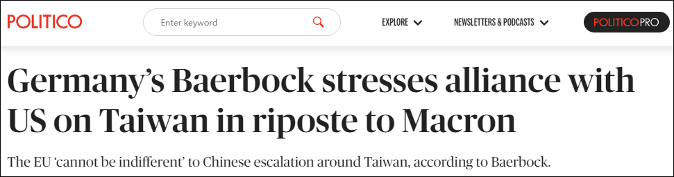 德媒称,马克龙关于台湾问题的言论,让他同华盛顿的盟友关系陷入困境。路透社13日则援引德国外交部提供的音频文件报道称,贝尔伯克当天在天津谈及台海局势时,以“经济重要性”为由声称:“德国和欧盟在经济上很脆弱,这意味着我们不能对台海紧张局势漠不关心”。