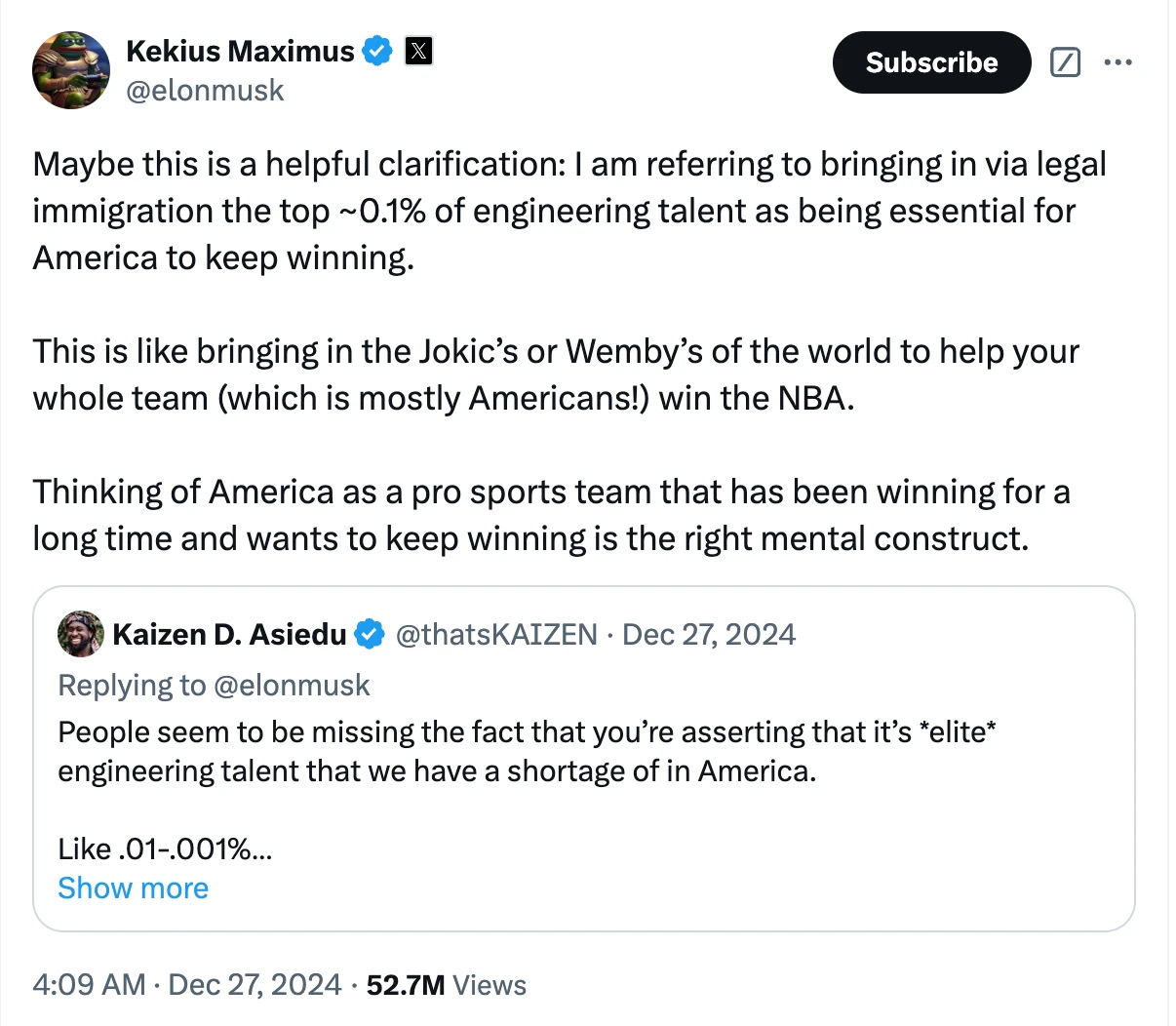 本周,马斯克与多名美国科技界亿万富翁公开呼吁增加高科技移民数量,并强调移民劳动力是美国创新的重要部分。12月26日马斯克发文表示,优秀工程师短缺是限制硅谷发展的根本因素,美国科技公司需要目前已有工程师人数“两倍”的顶尖人才,才能取得胜利:“为了让美国继续在国际舞台上赢下去,通过合法移民让0.1%的顶尖工程人员过来很重要。”马斯克表示自己出生在南非,当年就是靠着H-1B签证才来到美国成就了一番事业。