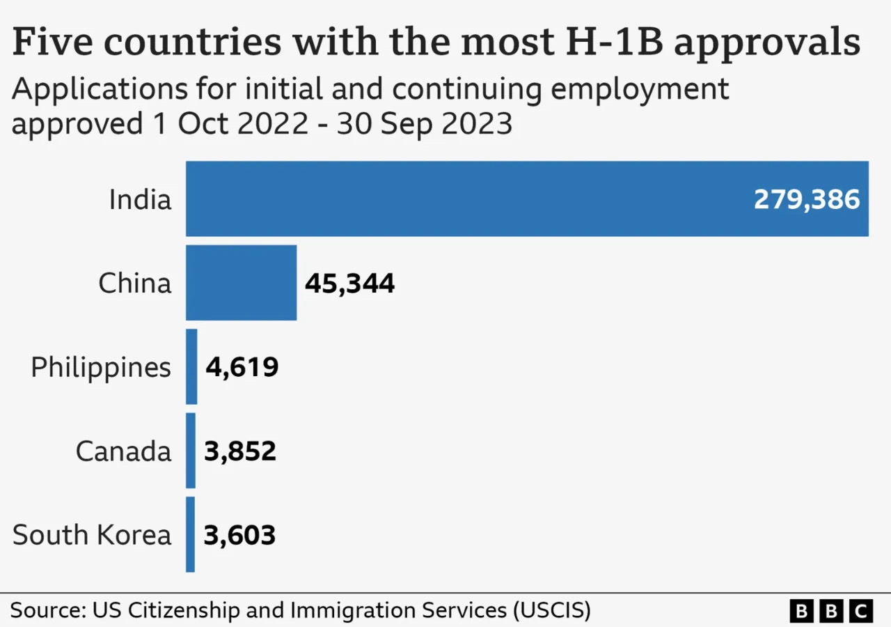 根据美国公民及移民服务局 (USCIS) 的数据,2023年度批准了超过386,000份H-1B申请,其中包括近 119,000 份新的 H-1B 签证和约267,000份现有签证的延期。2023年的总数低于2022年的 474,000 多人。不过这一数据在2024年激增,目前2024年数字还不完整,但美国移民局预计的数量达到了75万份。